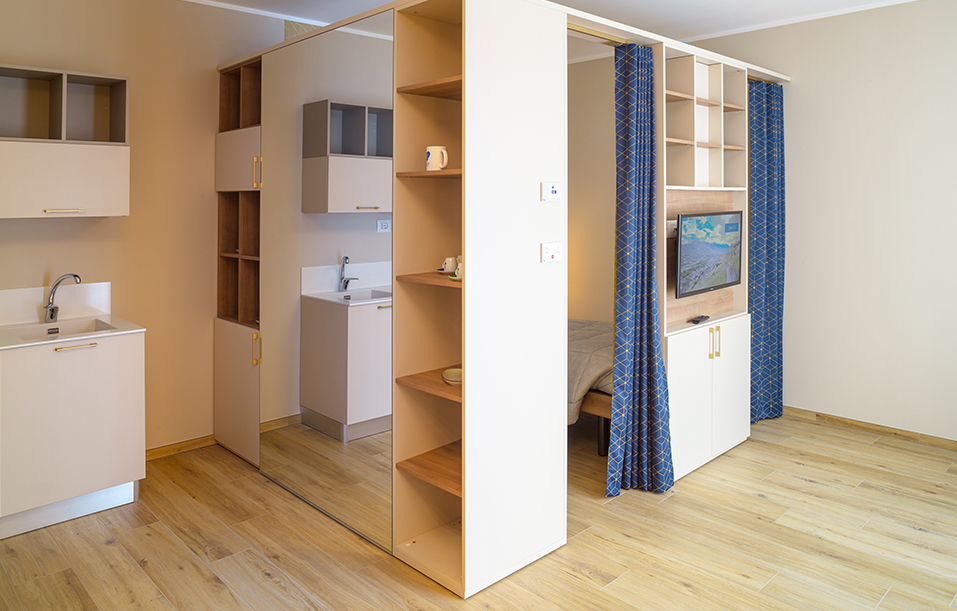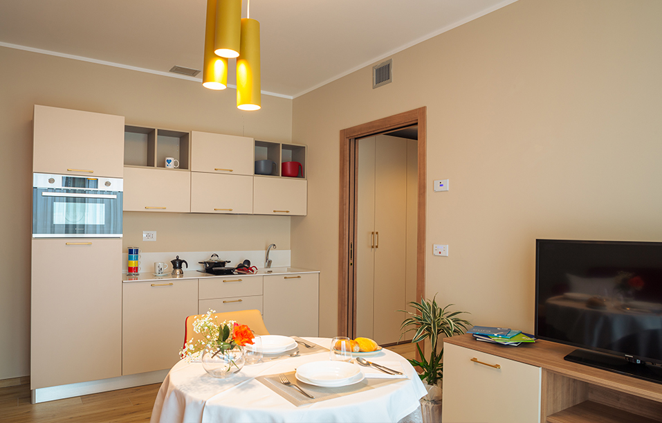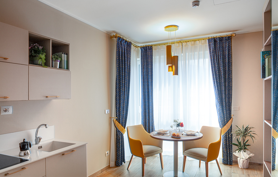 La struttura dispone di 16 Appartamenti Protetti suddivisi in 4 bilocali e 12 monolocali interamente arredati secondo i canoni del design contemporaneo.